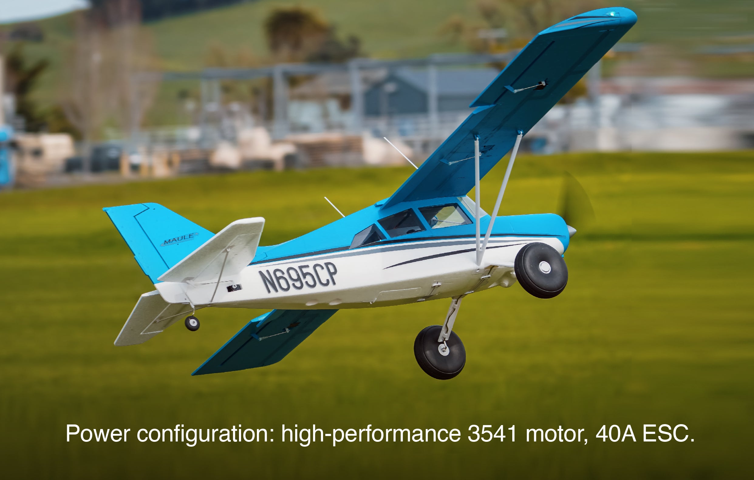 Maule can be equipped with two sets of landing gear - a tire set and a float set, for conquering both ground and water. The pre-installed 3S/4S compatible brushless power system delivers plenty of performance for flying from smooth or rough surfaces using the oversized wheels, or from water using the included float set. FMS Maule - enjoy unparalleled flying pleasure.