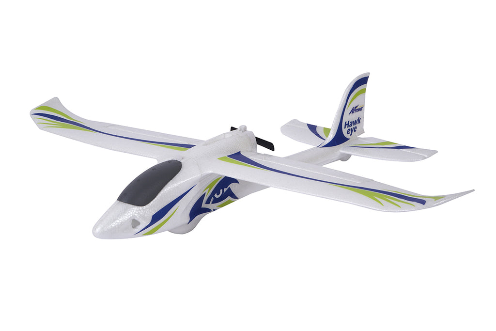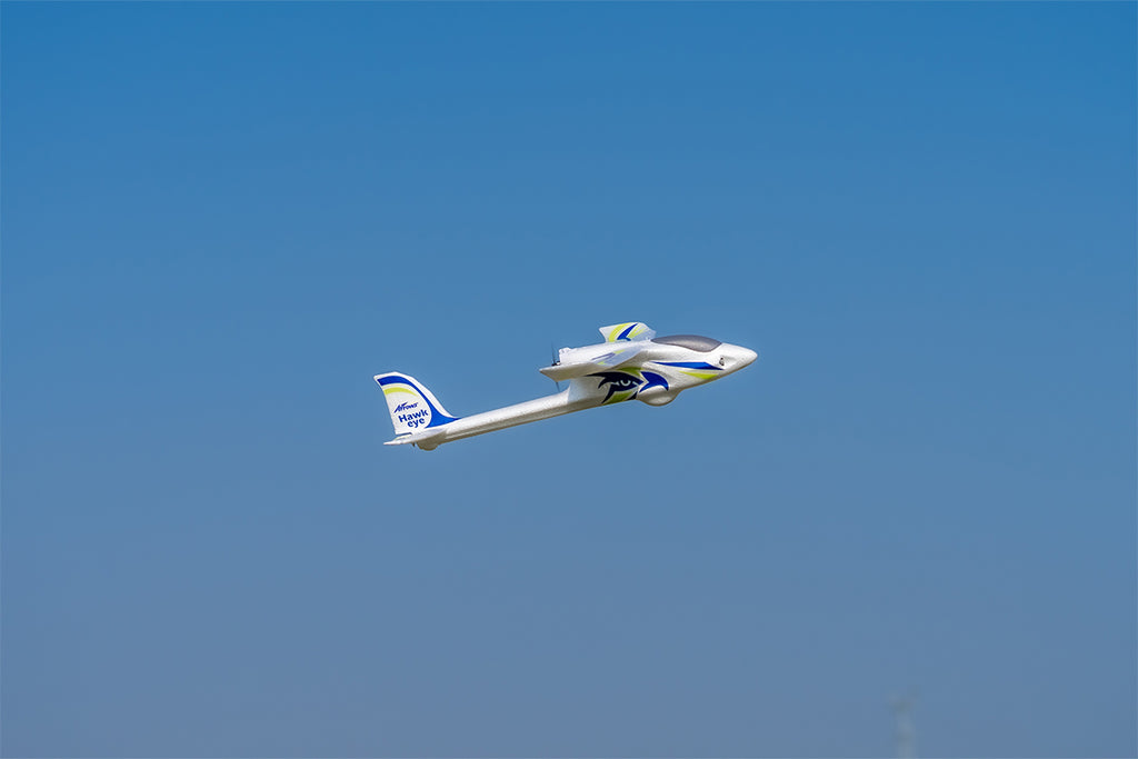 As a proper "all-rounder", the Hawkeye has a classic high-winged back-pushing design — allowing for predictable handling characteristics. The pre-installed ESC and flight control system eliminates the need for complicated wiring harnesses and setup. Switch between stabilized and optimized gyro flight modes and the Hawkeye will suit pilots of any skill level. In addition, unless the aircraft is completely upside down, it is almost impossible to damage the back-pushing propeller.