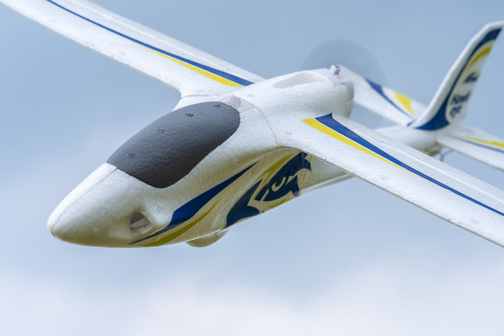 Robust EPP foam construction allow for rough-field operations — just install the wing onto the fuselage with the plastic knobs, plug in the battery, let the gyro calibrate and fly!