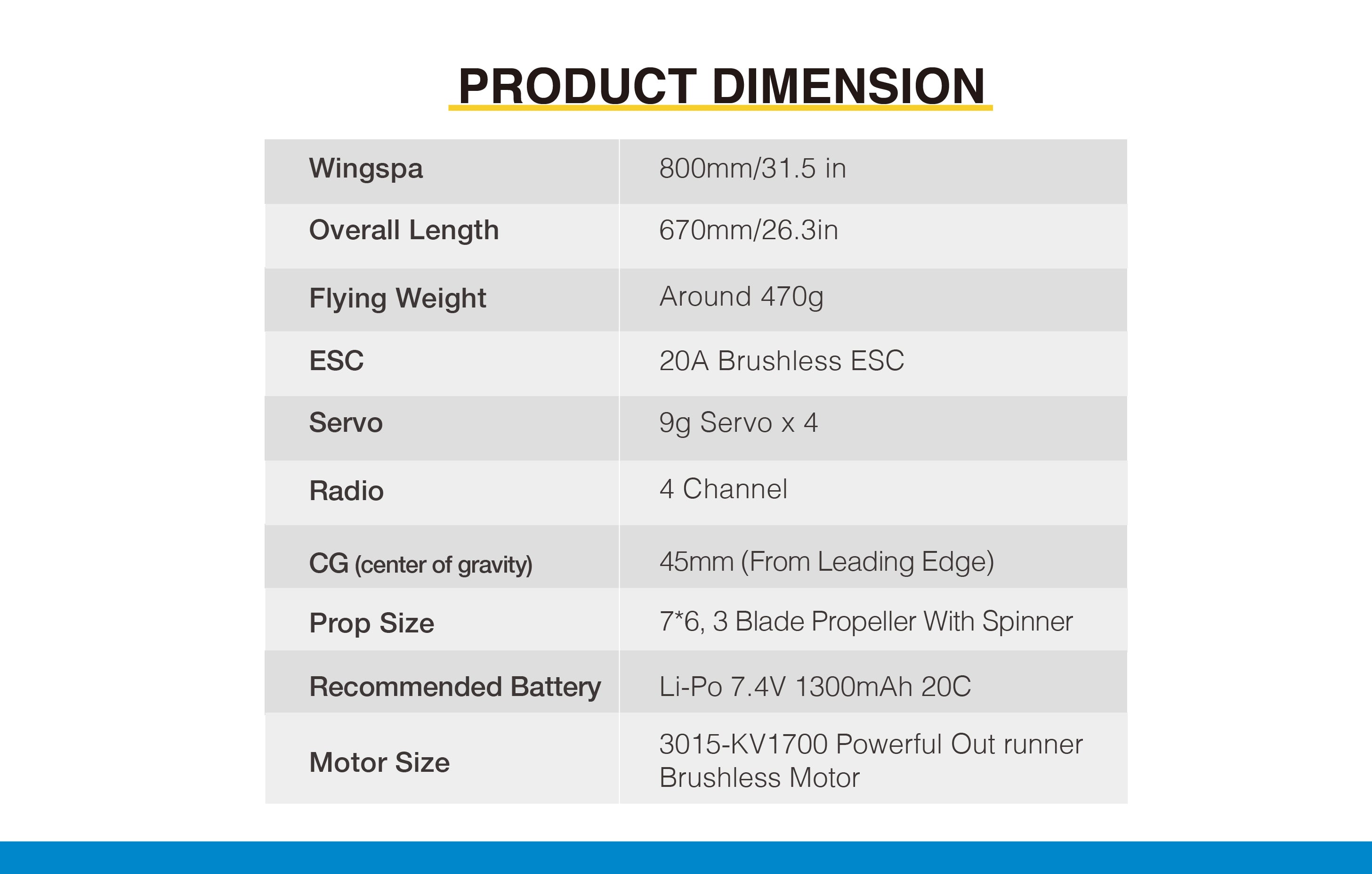 | Scale fuselage details, prop and spinner. | Powerful KV1700 outrunner motor. | Made of durable EPO foam. | |||