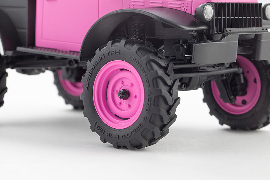 MATCHING PINK WHEELS Made of a soft rubber material, with coarse and solid tread patterns, the Power Wagon’s all-terrain tires have tremendous grip on rocks, mud and sand. The pink paint and detailed engravings add a nice aesthetic. |