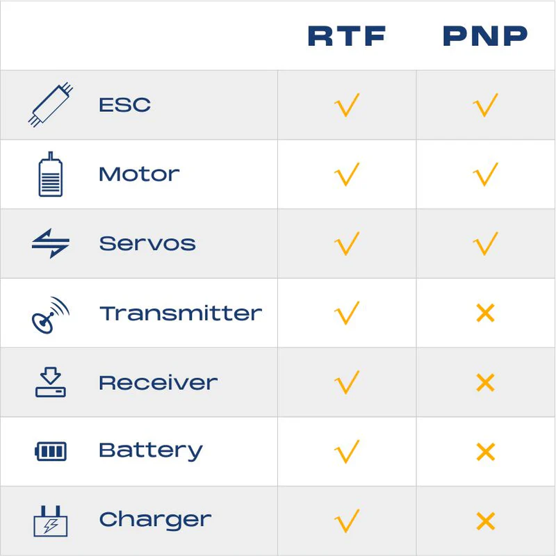 RTF(Ready to fly): A RTF plane includes the plane with the radio, receiver, battery, charger, motor, servos, retracts (if it has) and ESC already in place.